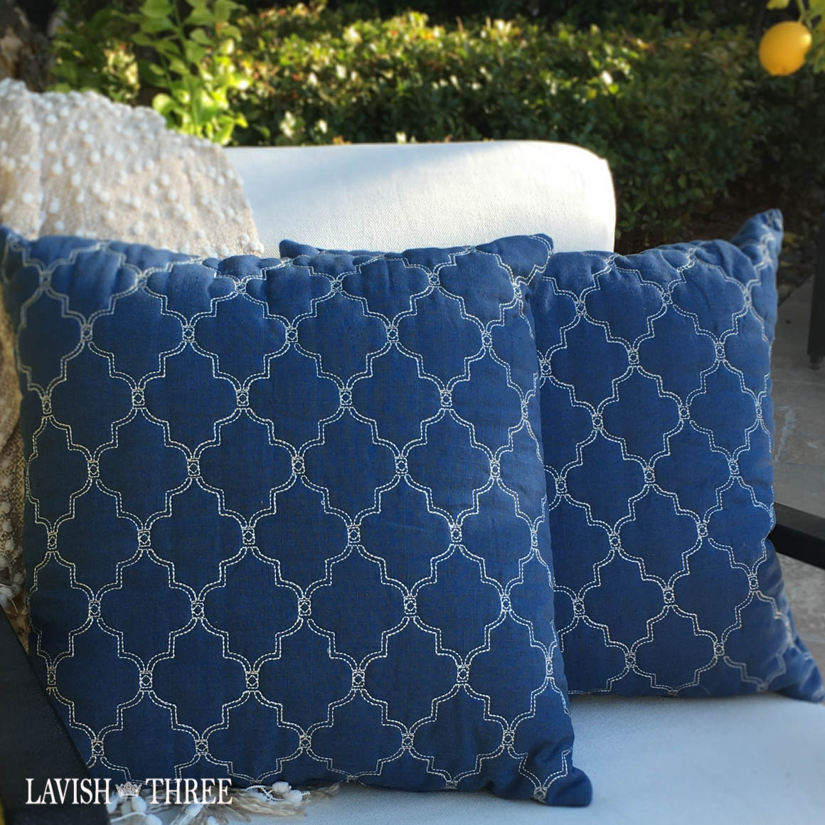 A beautiful blue palette is elegantly stitched with a timeless pattern of delicate white latticework. Spice up a simple chair with this touch of mosaic or add a bold splash of color to your poolside lounger!