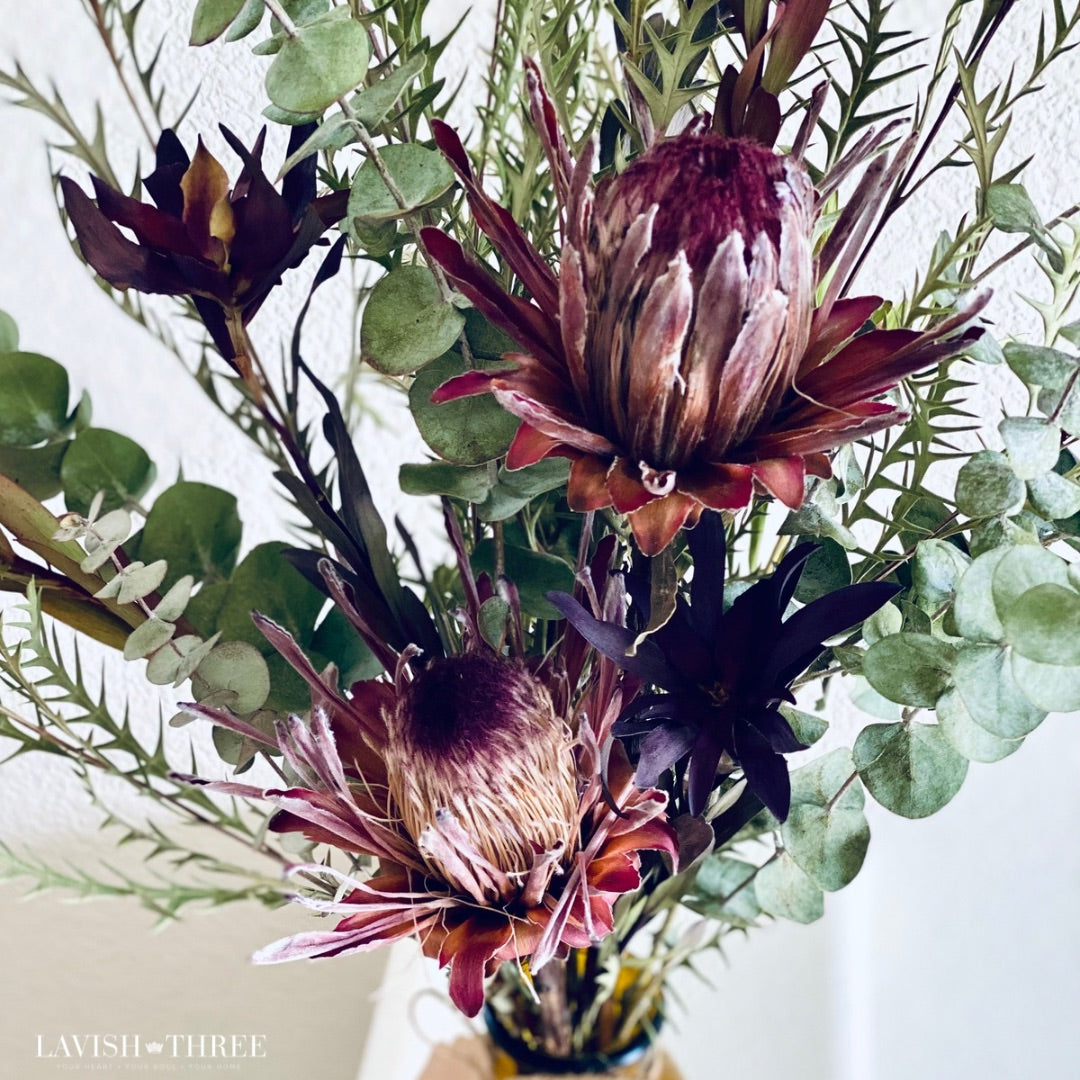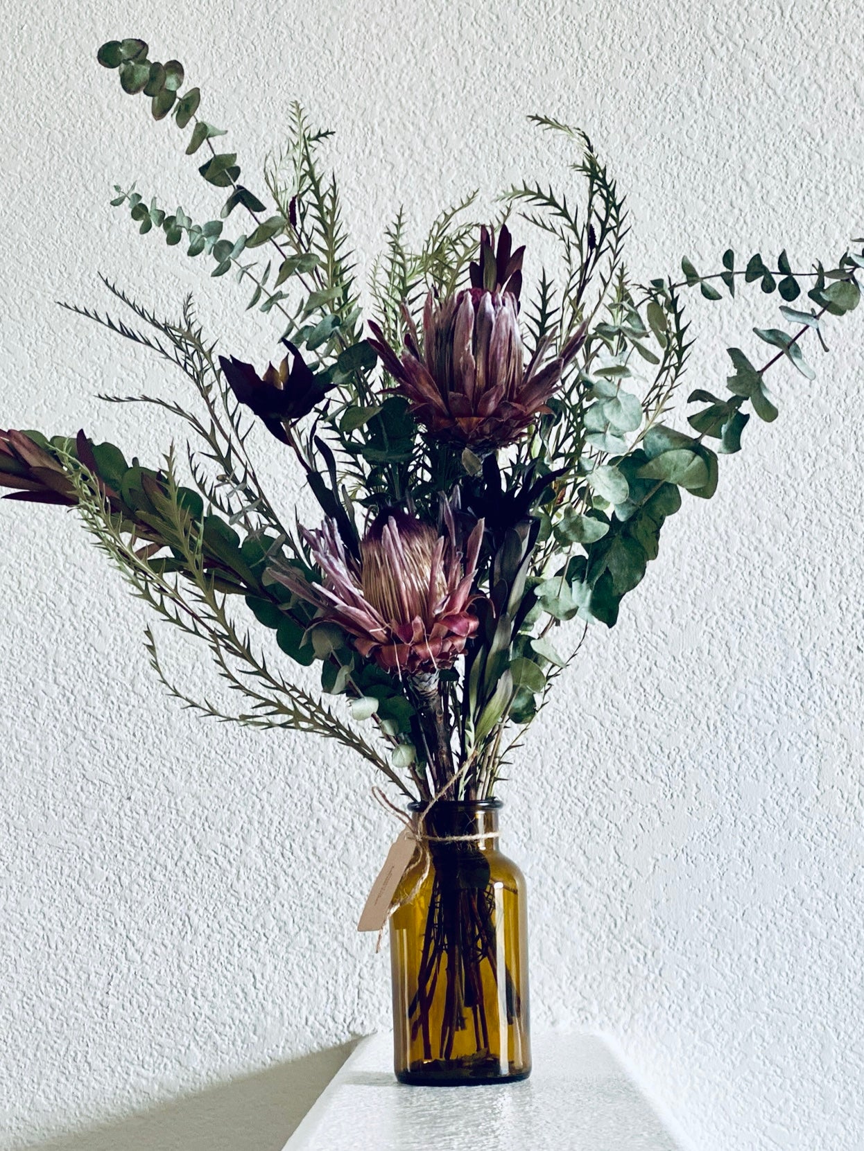 The hand-crafted dried King Protea bouquet is a stunning natural statement piece, adorned with preserved green eucalyptus and textured botanicals. Lush and earthy, it brings an inspiring, organic touch to any space while celebrating the timeless beauty of nature.